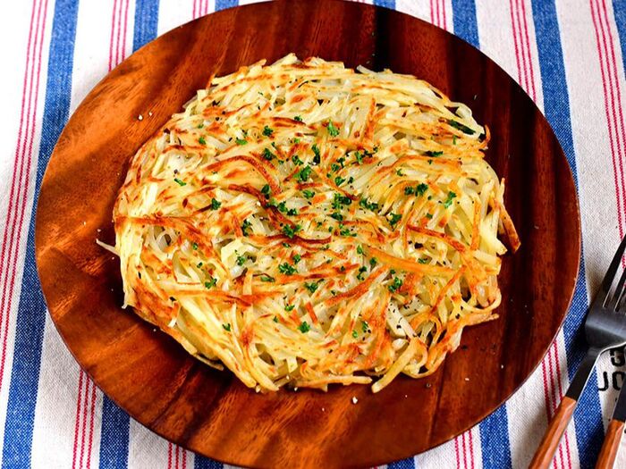 じゃがいもは皮をむいて、千切りにする。ボウルに入れ、塩(分量外)をして、しばらく置いておく。