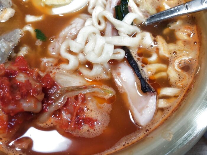 こんな感じで、麺が太いです。スープを飲めば、辛ラーメンのように辛いのですが、麺を食べるだけなら、そんなに激辛でもありませんよ!