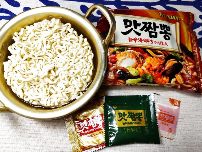 韓国ラーメンは水と粉末スープ、かやくなどを一緒に入れて煮込むものが多いので、特に簡単なんです!