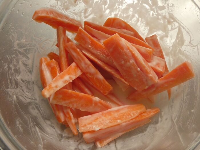 米粉と水を混ぜ合わせて人参を入れます。