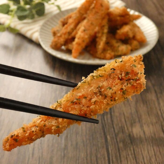 パン粉と青のりを混ぜ、人参につけます。