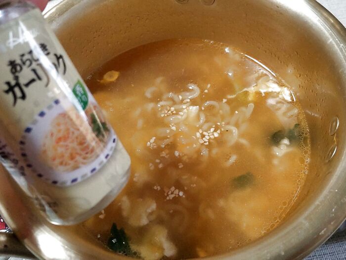 途中で、あらびきガーリックを入れて味変してみましたよ!これまた、いい感じです。