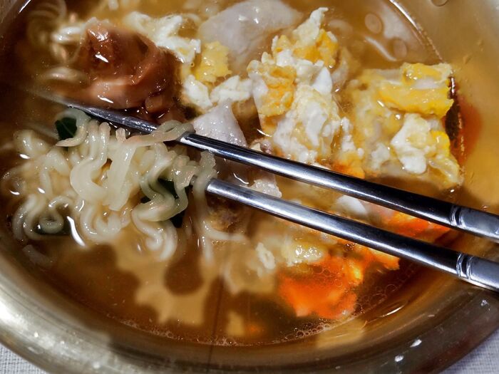 完成したラーメンに、豚バラ肉と卵を一緒に焼いたものを適量加えて、さらに冷蔵庫にあったしなちくも入れてみました。韓国では、韓国専用鍋に入れてそのまま食べるスタイルなので、同じように食べればさらに楽しいですよ!
