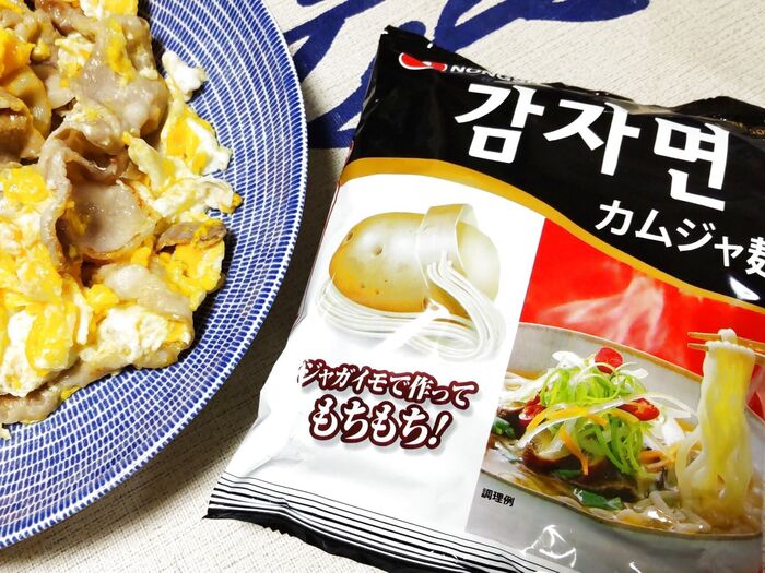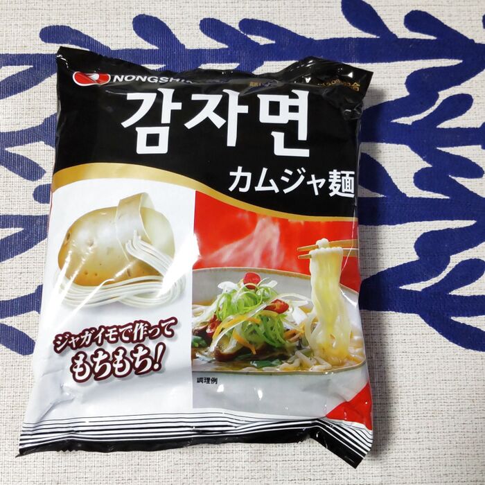 今回の韓国ラーメン「カムジャ麺」は、牛肉しゃぶしゃぶ味のスープで、椎茸、じゃがいも、チンゲン菜などの薬味が入っているそうです。パッケージもお洒落で魅力的ですね。
