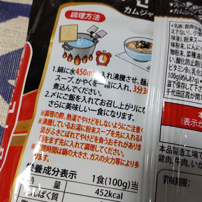 作り方は、裏面にも記載されていました。沸騰させたお湯450mlに麺、粉末スープ、かやくを入れ約3分30秒間煮込むと出来上がりです。
