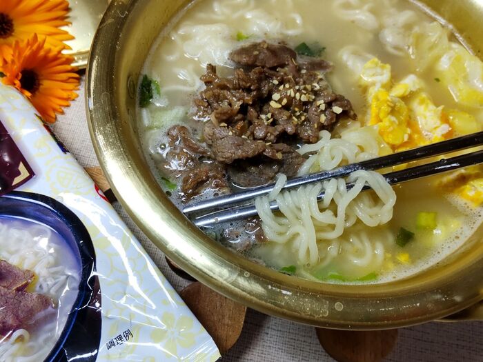 韓国ラーメンのあの刺激的な辛さが感じられません。薄いとんこつラーメンのような感じですよ。牛肉ベースの旨味などをベースにした塩ラーメンなので、本当あっさりしています。