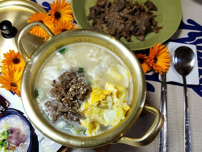 体にやさしい感じのまろやかスープです。今回は、コストコのしっかり旨味のある濃い目の味の「プルコギ」と「キャベツと卵を炒めたもの」と「ガーリック」を加えて頂きましたよ。