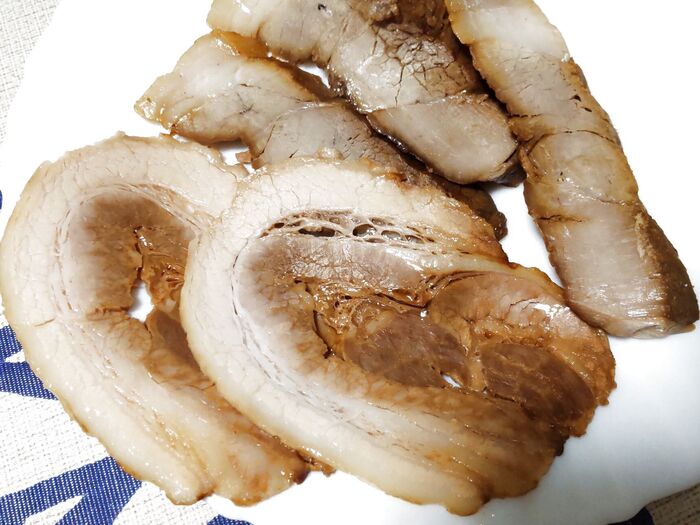そのまま食べても良いのですが、煮豚と厚切りチャーシューを加えていただきますよ!