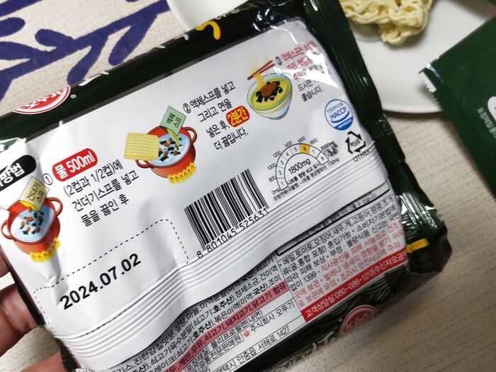 裏面に作り方がのっていますよ。500mlの水とかやくを入れて沸騰させ、乾麺と液体スープを入れ、2分煮て完成です。韓国インスタント麺の中でも、群を抜いて早く作れますねー!時短で作れるのが嬉しいですね!