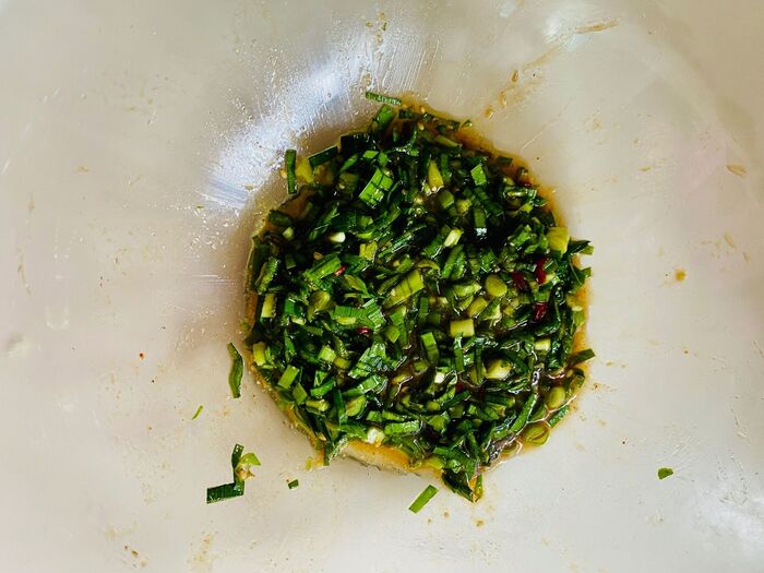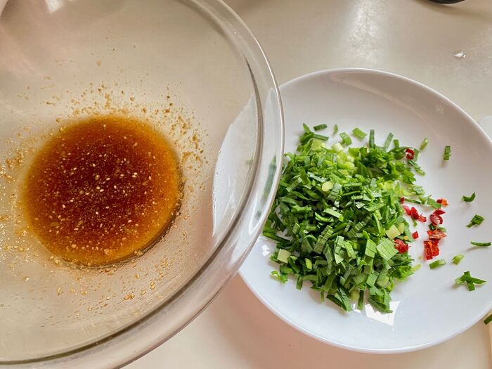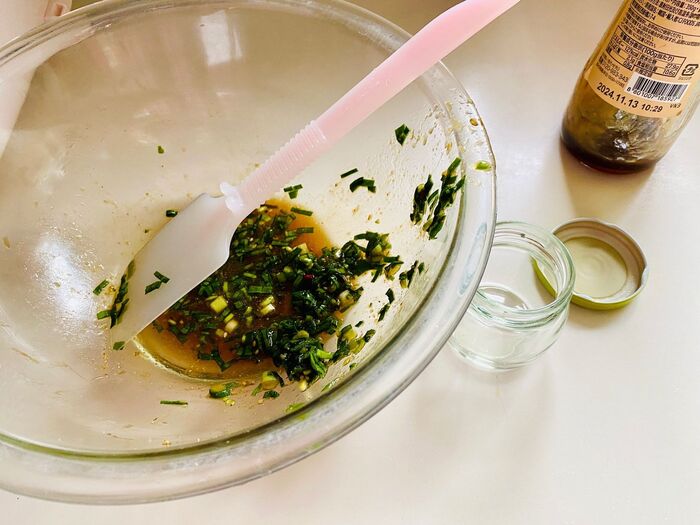 ニラと鷹の爪はボールに入れて、aの合わせ調味料を入れよく混ぜます。
