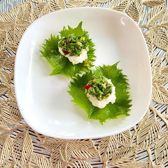 大葉に一口大に握ったおにぎりを乗せ「甘辛万能ニラだれ」を乗せて包んで食べますよ。