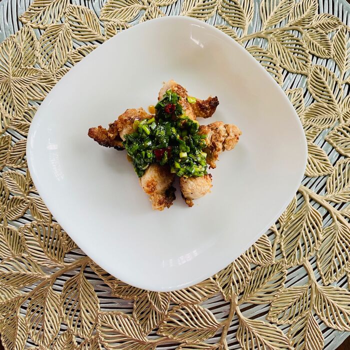 朝、お弁当に作った鶏の唐揚げを軽く温め「甘辛万能ニラだれ」をかけました。