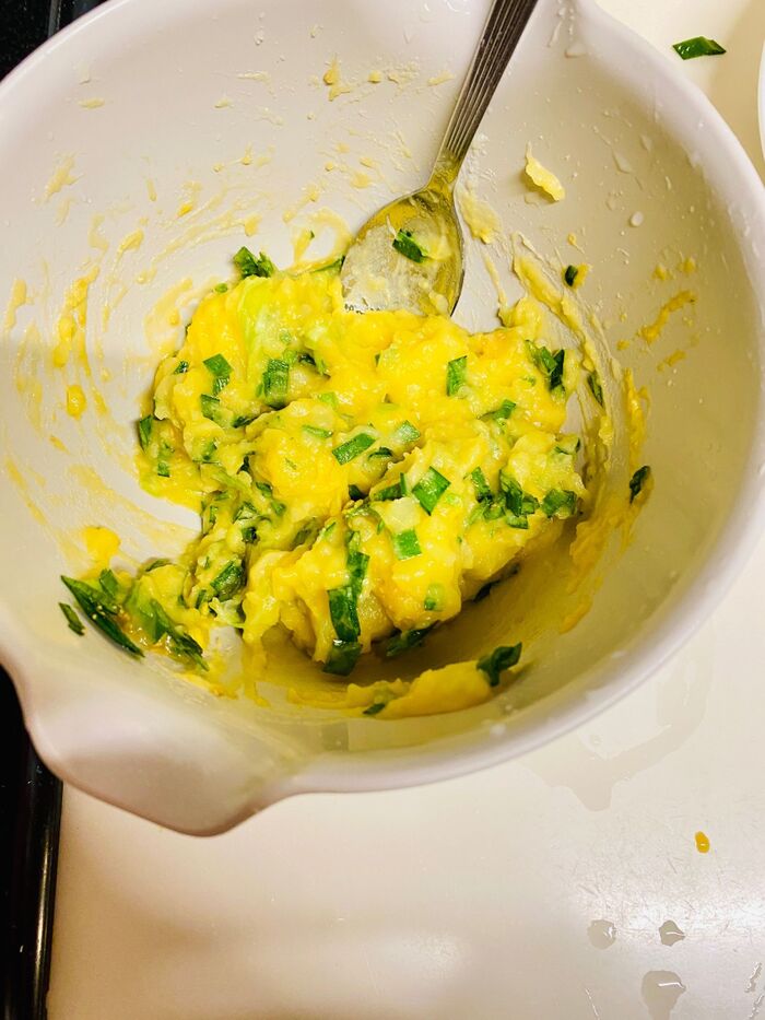 みじん切りにしたニラ、溶き卵、鶏がらスープの素を入れよく混ぜます。