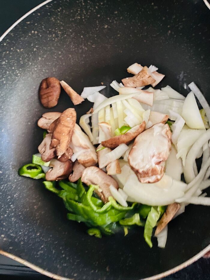 玉ねぎ、ピーマン、椎茸はスライスします。