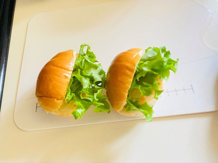 次に、バターロールパンに切れ目を入れて、切り口にマヨネーズを薄く伸ばします。