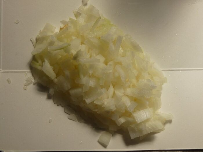 玉葱はみじん切りにします。耐熱容器に入れて電子レンジ600wで1分半加熱します。