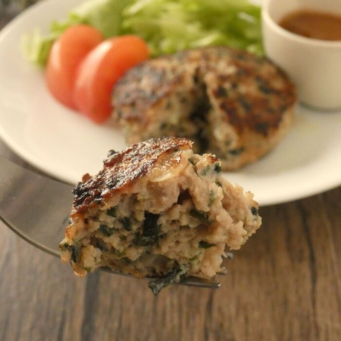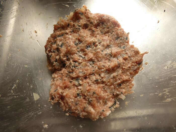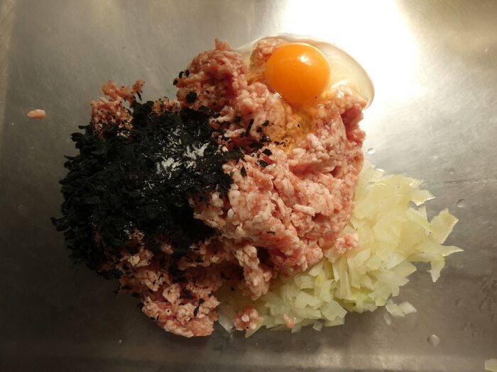 ひき肉とあら熱が取れた玉葱、ワカメと卵と塩を混ぜ合わせます。