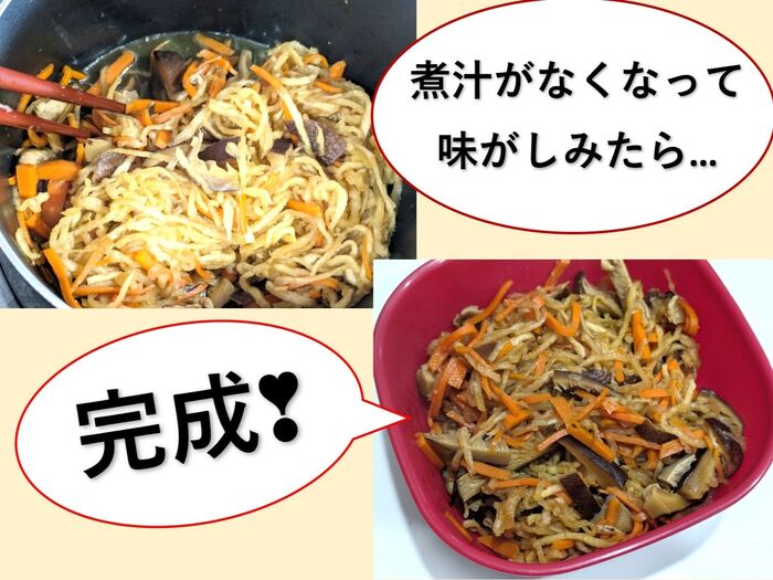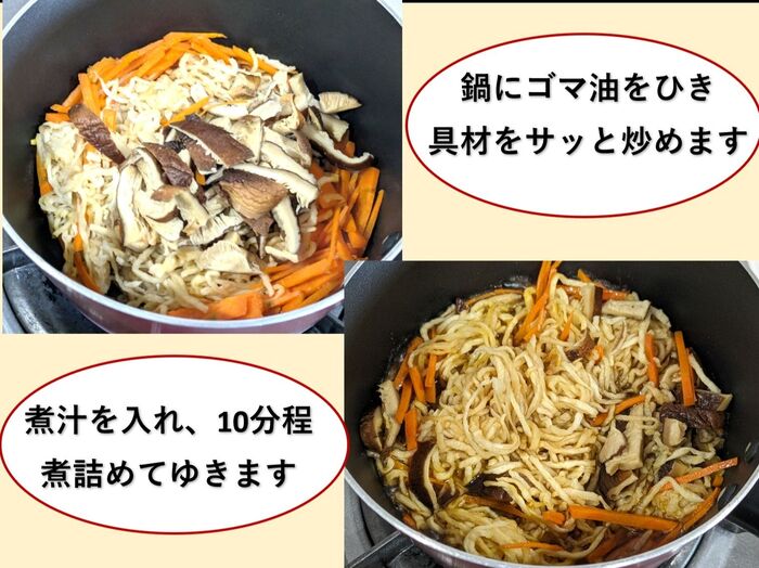 ※干しシイタケの戻し汁は、そのまま煮汁に使います。