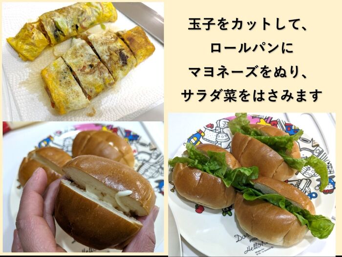 あとはロールパンの切り込みにマヨネーズをぬって、サラダ菜をはさみます。