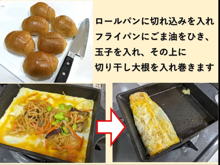 甘辛い和風の切り干し大根と卵、そしてマヨネーズ、そしてパン。