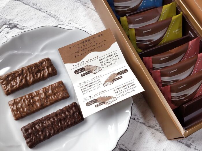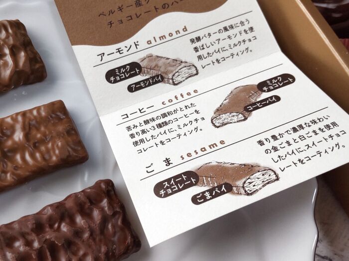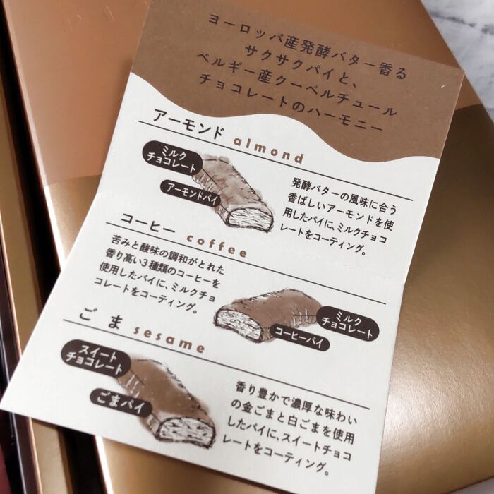 「ヨーロッパ産発酵バターを使い何層にも折り込んで焼き上げた薄いパイ生地とベルギー産クーベルチュールを使用した、 サクッと軽やかな食感と、口溶けのよいチョコレートのハーモニーが絶妙な本格的なパイチョコ菓子です。」