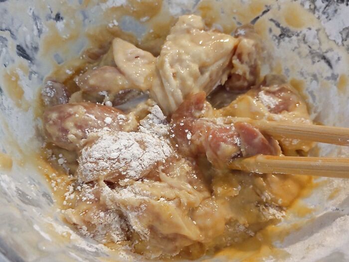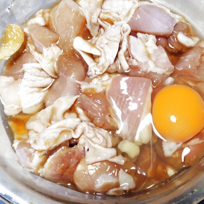 ①鶏肉を唐揚げ用にカットし、すりおろしにんにく、醤油、酒を加えて揉み込む。