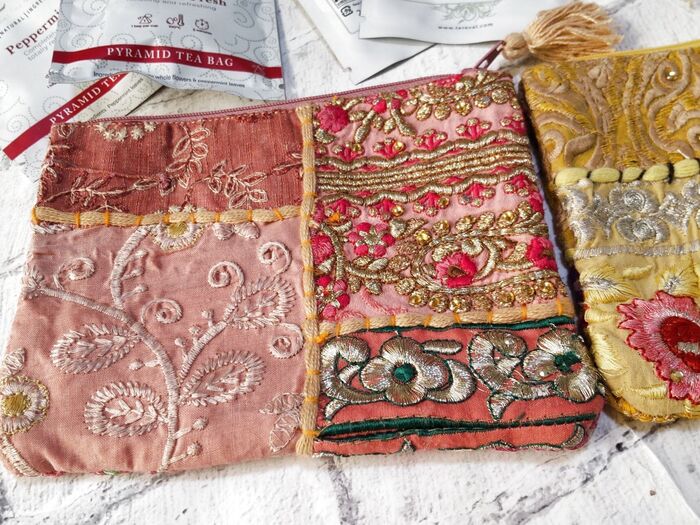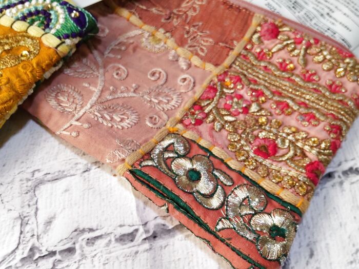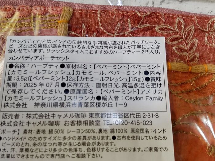 カルディの「カンバディアポーチ」は、インドの伝統的な手刺繍が施されたパッチワーク、ビーズなどの装飾がある色とりどりの古布を職人が丁寧につなぎ合わせて作られています、と商品裏に説明書きがありましたよ。