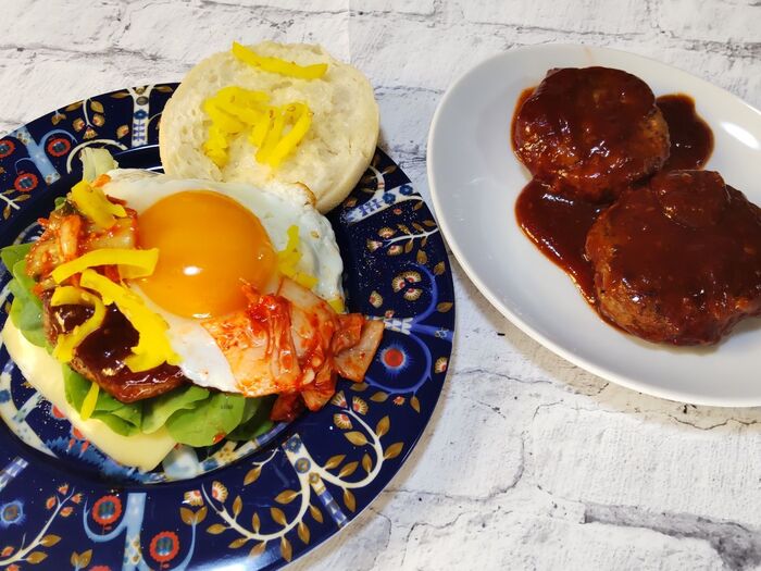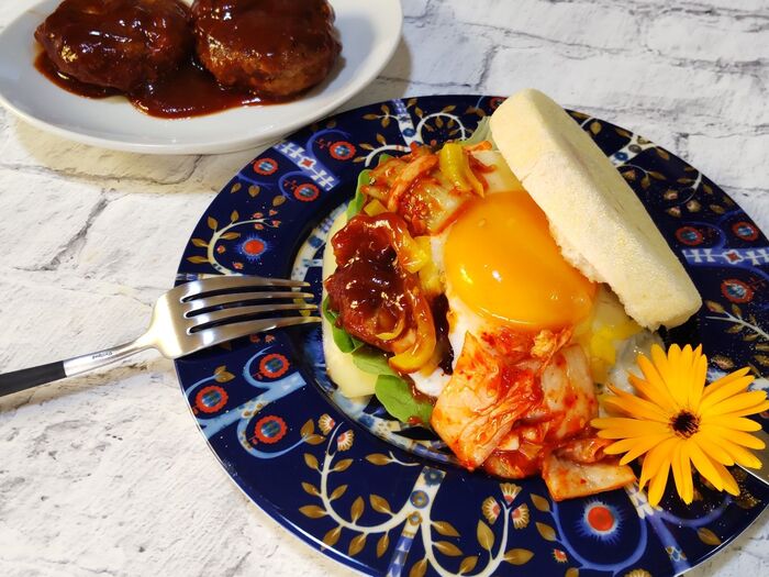 ⑦ハンバーグの上に目玉焼きをのせ、キムチと刻んだたくあんを目玉焼きの横に添えるようにします。