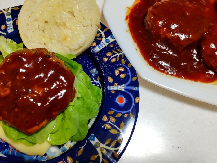 ③混ぜた材料を4等分に分け、丸めて空気を抜き、平らにしてフライパンで焼きます。表面がこんがり焼けたらひっくり返し、蓋をして弱火で蒸し焼きにします。焼き上がったら皿に取り、残った油と♯を混ぜてハンバーグのソースを作ります。