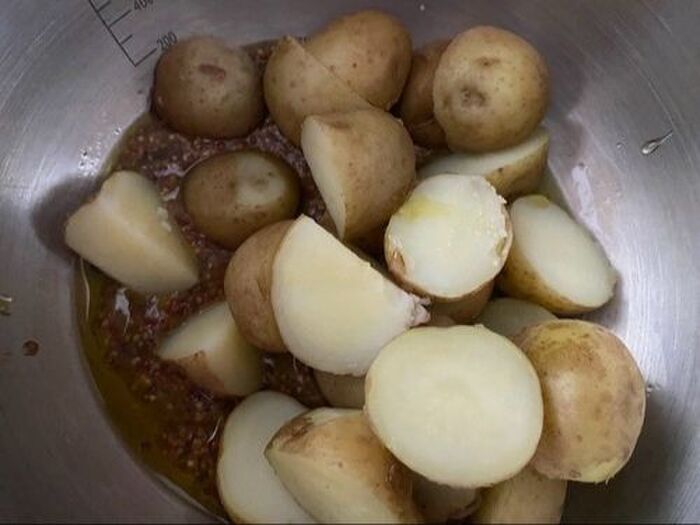 オリーブオイル、粒マスタード、はちみつを加えよく混ぜ、新じゃがから入れてよく混ぜ合わせる。