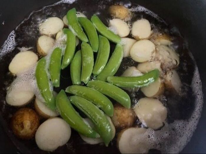 新じゃが(小粒)は、よく洗い皮付きのまま半分に切り、塩を加えたお湯で茹で、竹串などがスッと入るぐらいになったらスジをとったスナップエンドウを加え、同時に茹で上げる。