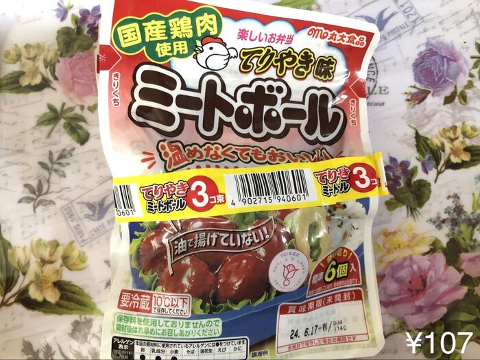 当初ハンバーグがこの価格だったようですが、品切れのためミートボールが107円に!