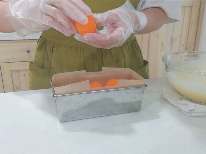 蜜柑の上にムースを蜜柑が隠れるまで流し込む。