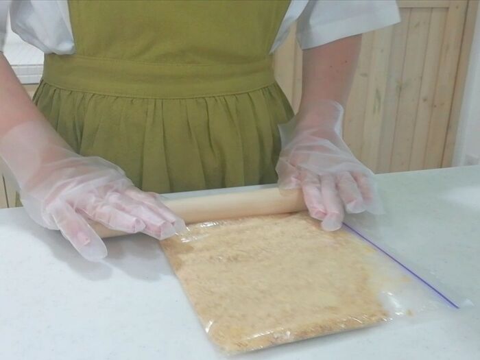 保存袋の上から麺棒を転がしてビスケットを細かく砕き、溶かした無塩バターを加え揉んで馴染ませる。