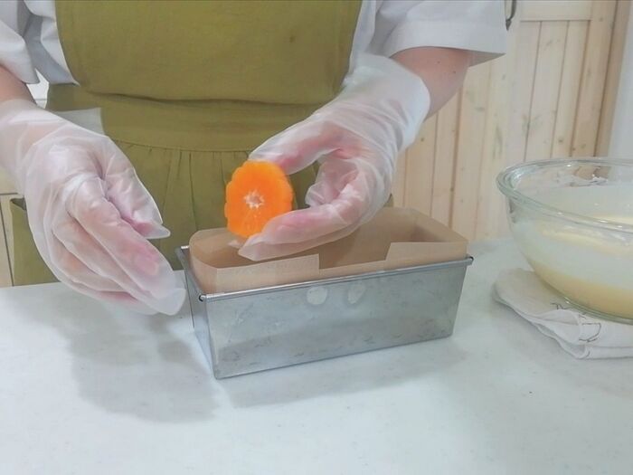 土台のムースが冷えたら、半分に切った蜜柑を側面に貼り付ける。