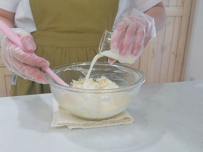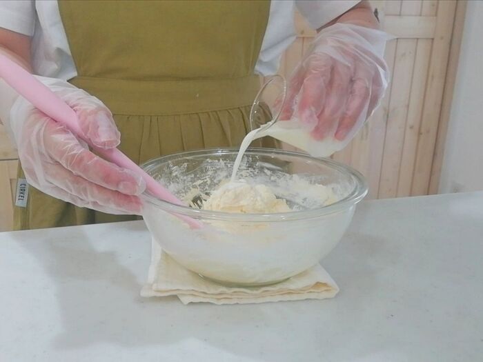 溶きほぐした卵を少量ずつ加え、その都度よく混ぜる。