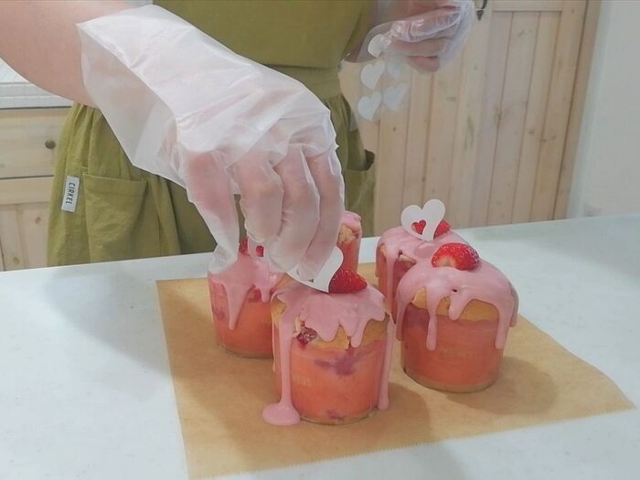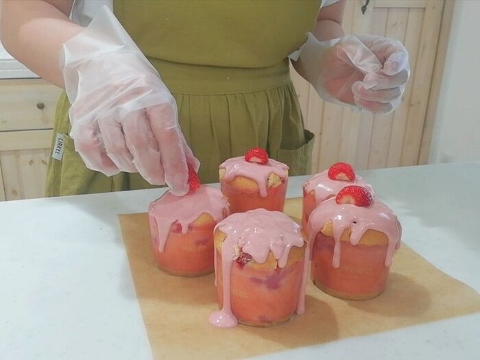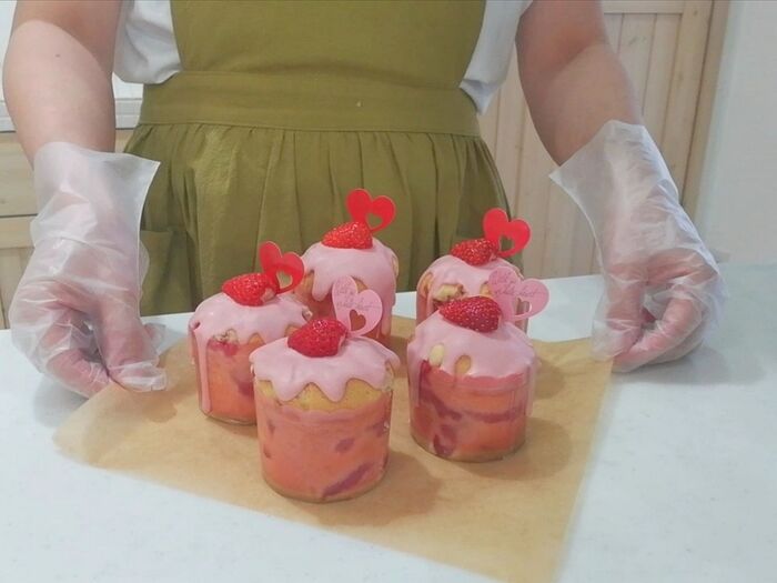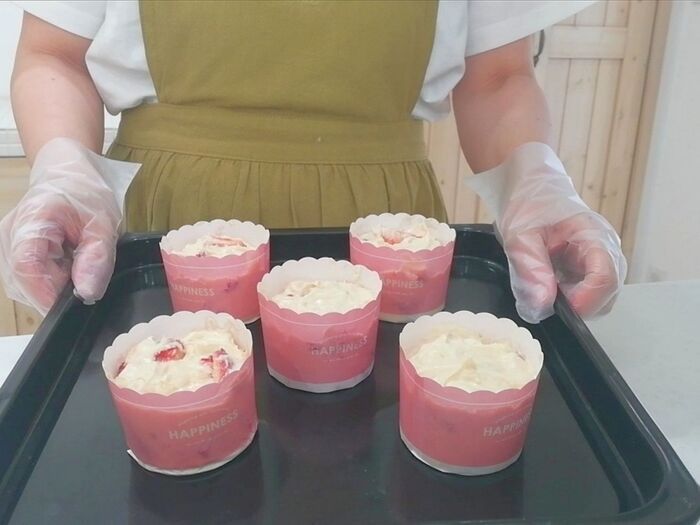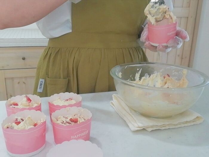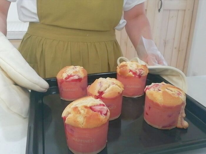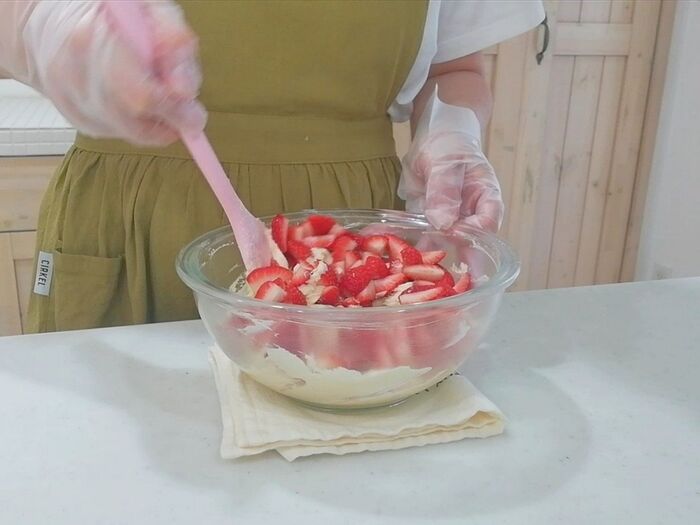 ※混ぜ過ぎると苺の水分や色素が出て、ベチャッとしたマフィンになってしまうので混ぜ過ぎ注意。