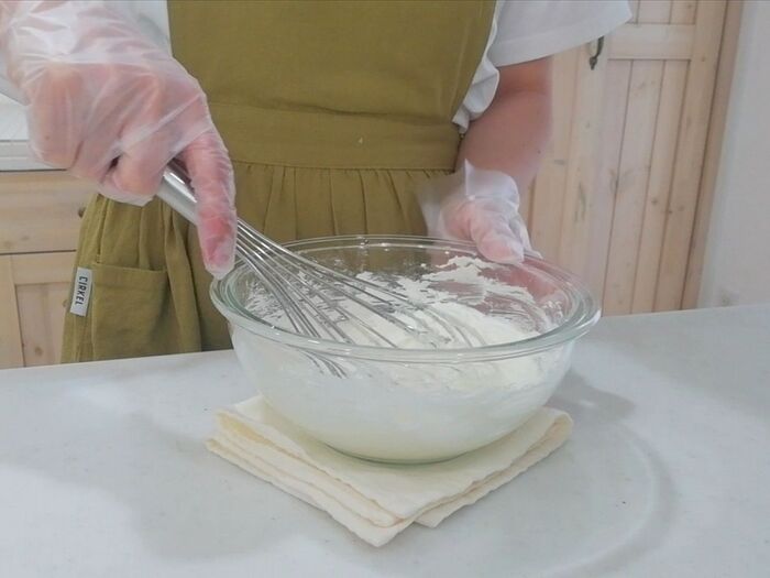 砂糖を加え、白くふんわりもったりするまで混ぜる。