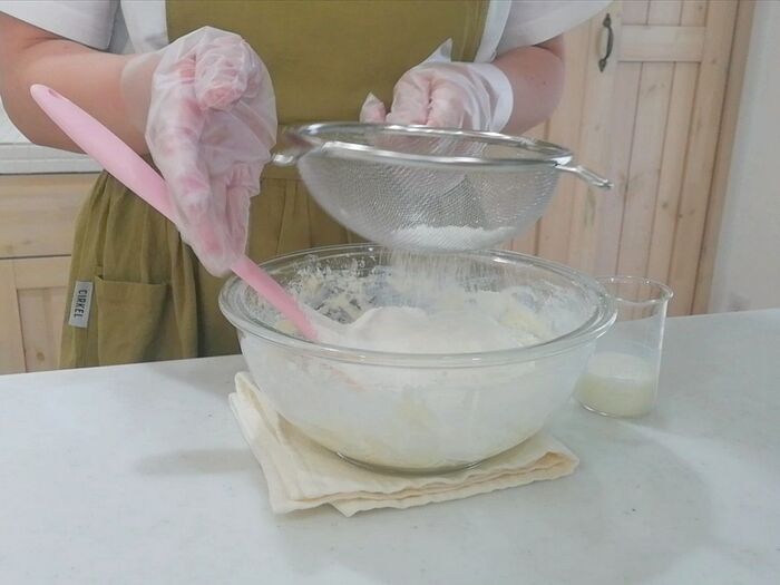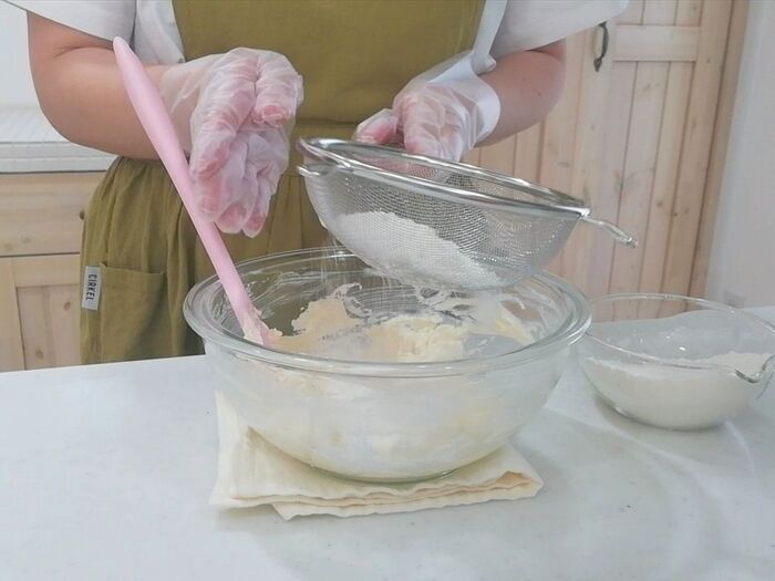 残りの粉類の半量をふるい入れ、切るように混ぜる。