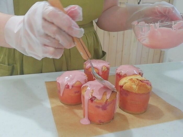 粗熱がとれたらマフィンにかけていく。垂らしたい場合は柔らかめでかけ、垂らしたくない場合はチョコを混ぜて固さを調整してかける。