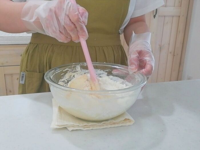 ※白くふんわりもったりするまで空気を含ませるように混ぜることでふんわりマフィンに仕上がります。