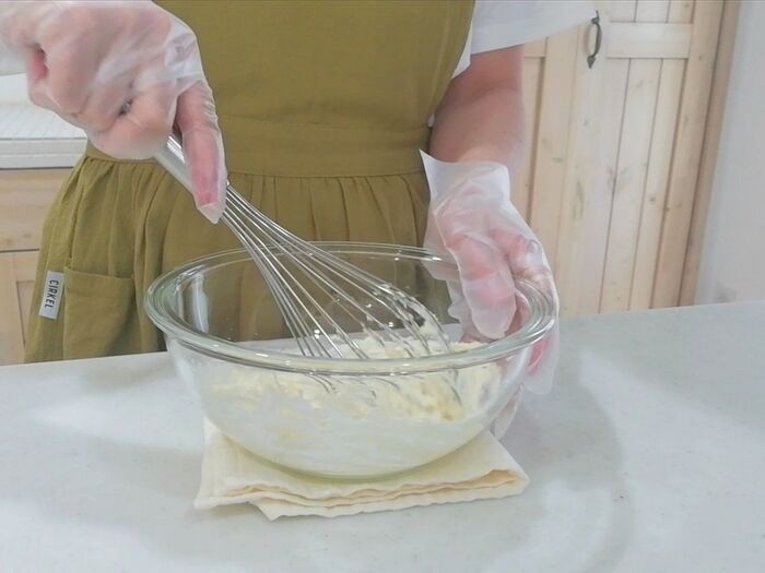 ボウルにマーガリンを入れ、泡立て器でクリーム状にもったりするまで混ぜる。