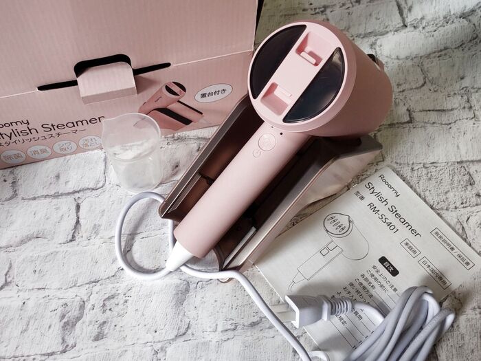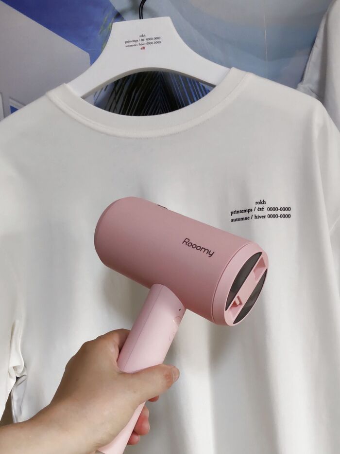 ピンクカラーでとっても可愛いです!開封して、早速、試してみました。手に持った感じは、ドライヤーのような重さですね。本体の重さは約750gで、少し重いですが、2〜3枚の衣類に使用する分には全く問題ありません。