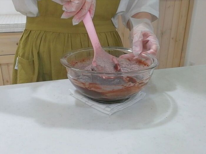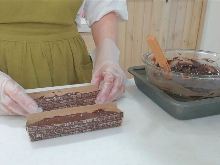 型に入れ、台に数回落とし空気を抜き、表面を平らにする。