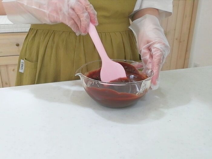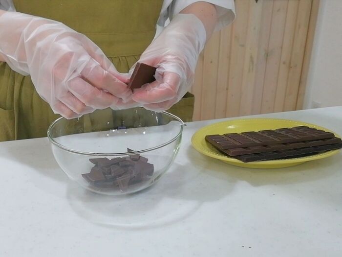 耐熱容器にチョコを割り入れ、バターを加えて600Wのレンジで1分30秒加熱する。