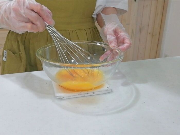ボウルに卵を割り入れ、砂糖と塩を加え混ぜる。(泡立てずに混ぜる程度)