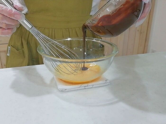 混ぜた卵に溶かしたチョコを少しずつ加え泡立てないように混ぜる。