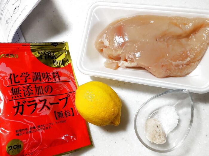 レシピ通りに「サラダチキン」を作ることにしました。必要な材料は鶏むね肉1枚、レモン汁、砂糖、塩、そして鶏ガラスープの素だけです。