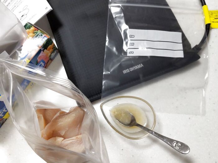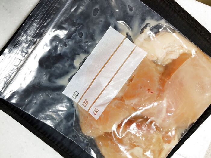 チャック付き密封袋に、3等分にした鶏むね肉と調味料を入れて揉み込み、空気を抜いてチャックを閉じるだけ!あとはスイッチを押すだけでOK!
