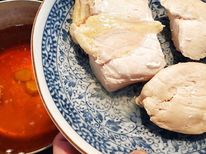 (鶏飯は通常出汁と共に茹でます、なので、鶏肉がパサパサしがちです)
